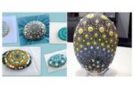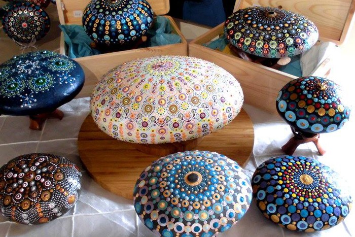 Le plus difficile est parfois de choisir parmi les créations, mais à un moment donné il y a la magie qui opère lorsque l’oeil se pose sur un galet qui reflète un univers qui nous tient à coeur. Ici le bleu de l’océan et la nacre des coquillage. Là, une galaxie ou le souvenir d’un voyage. Là encore, les couleurs de la terre, un mantra, un mandala. Ici une explosion de joie.