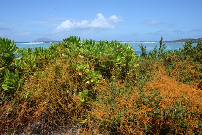 Cette liane orange, Cassytha filiformis, rampante et grimpante, est présente sur certaines plages de la Réunion. C’est une peste végétale poussant dans le sable qui prolifère très rapidement et étouffe les espèces de bord de mer que nous plantons à La Réunion pour préserver le littoral et restaurer les sites de ponte des Tortues marines.